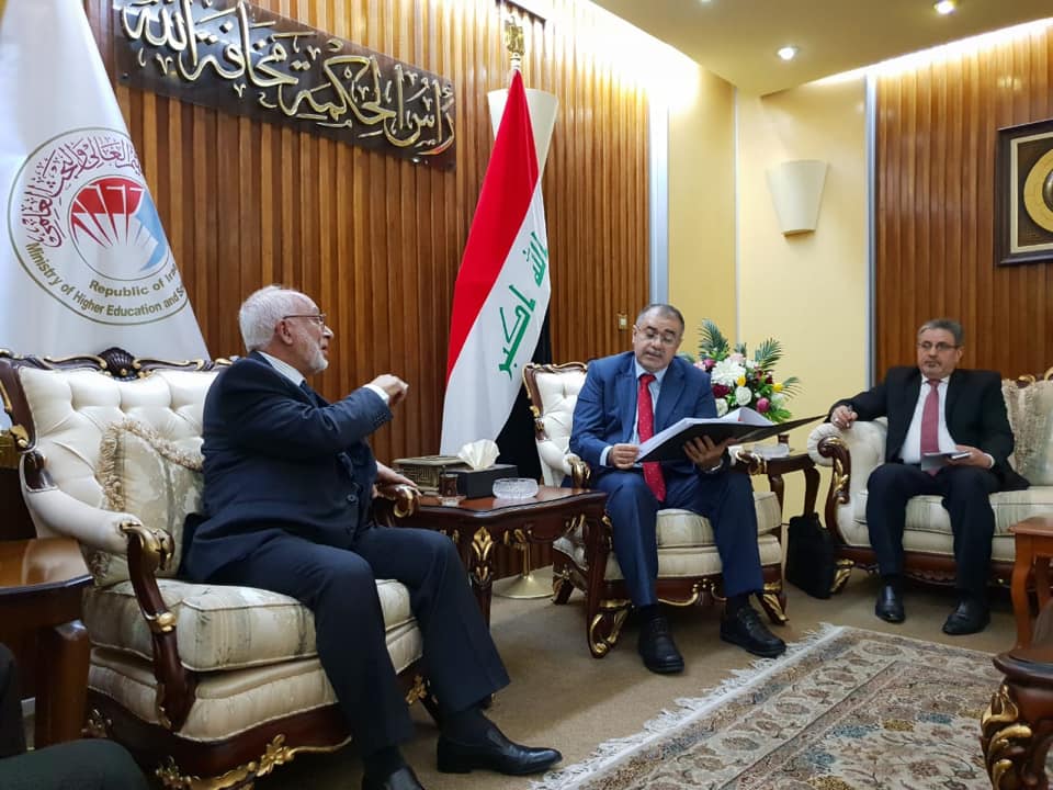 زار وفد من جامعة وارث الأنبياء التابعة للعتبة الحسينية المقدسة برئاسة الاستاذ الدكتور طالب حسن موسى رئيس الجامعة وزير التعليم العالي والبحث العلمي لتأكيد حرص الجامعة على النهوض بالواقع التعليم في البلد والرصانة العلمية وايضا لتهنئته بمناسبة تسلمه منصب الوزارة ورافق الوفد السيد المساعد العلمي الاستاذ الدكتور عباس الدعمي ومدير ادارة الجامعة