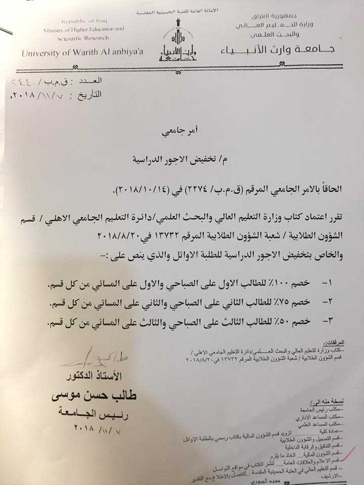 قررت رئاسة#جامعةوارث_الانبياء_التابعة_للعتبة_الحسينية_المقدسة وحسب كتاب وزارة التعليم العالي والبحث العلمي بتخفيض الأجور للطلبة الاوائل وكالاتي:١.خصم ١٠٠٪؜ للطالب الاول على الصباحي والطالب الاول على المسائي2. خصم ٧٥٪؜ للطالب الثاني على الصباحي والثاني على المسائي3. خصم ٥٠٪؜ للطالب الثالث على الصباحي والثالث على المسائي.