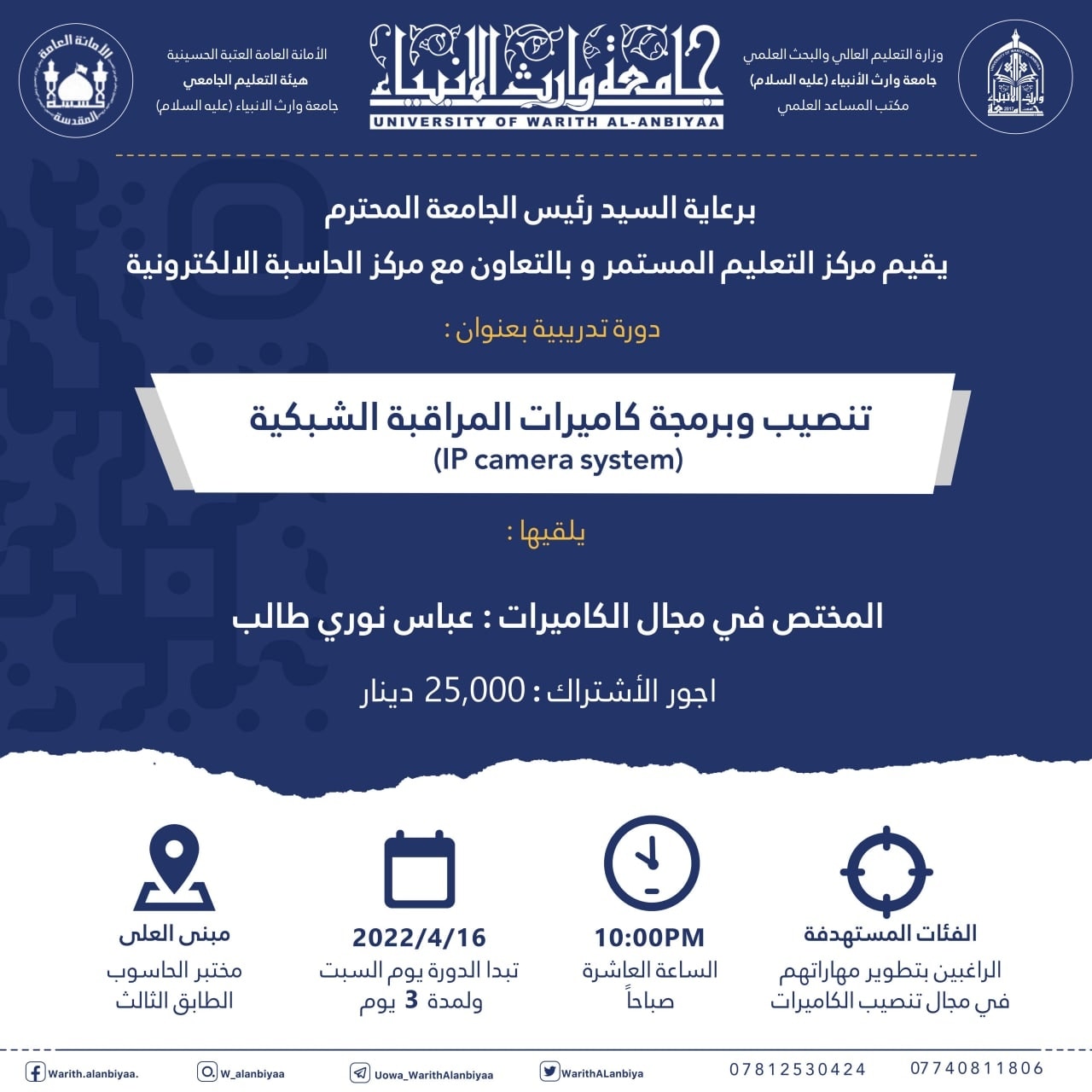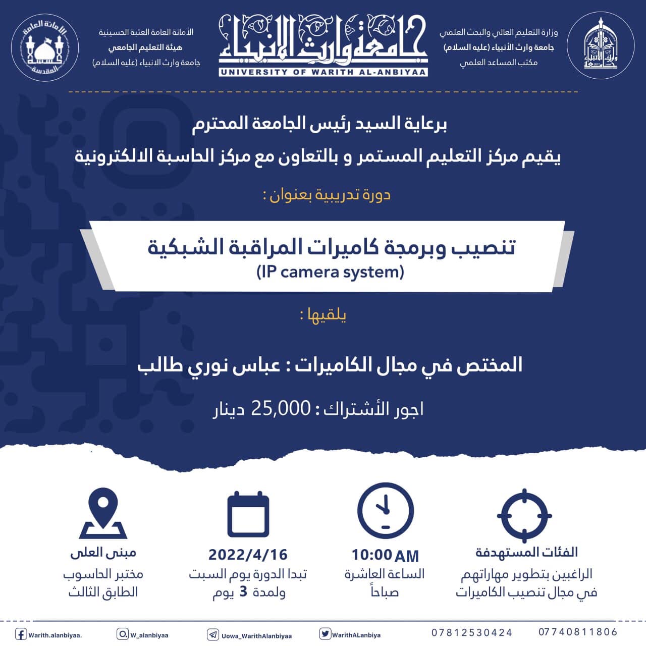 تنصيب وبرمجة كاميرات المراقبة الشبكية دورة تدريبية في جامعة وارث الأنبياء