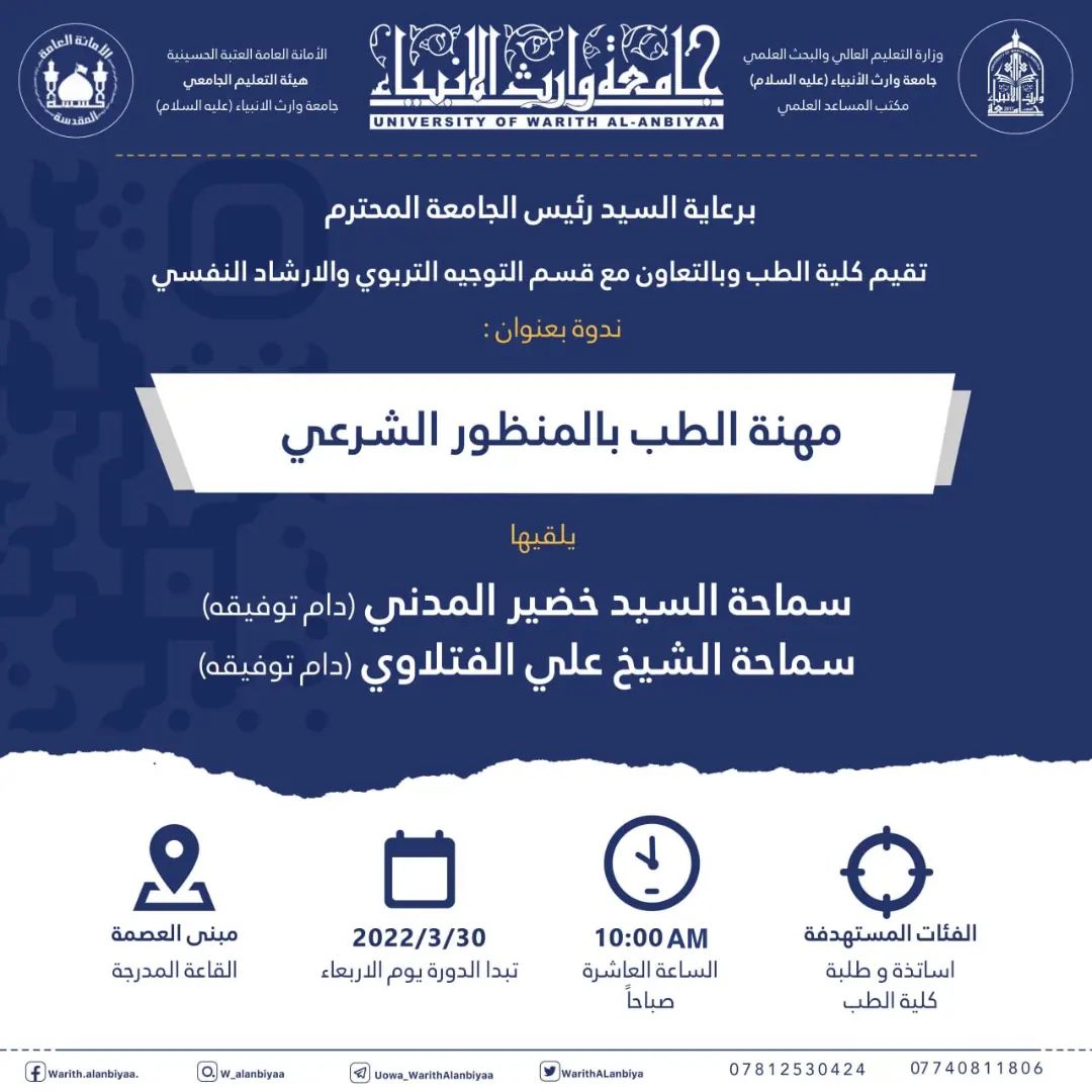 تقيم كلية الطب وبالتعاون مع قسم التوجيه التربوي والارشاد النفسي ندوة بعنوان " مهنة الطب بالمنظور الشرعي " يلقيها سماحة السيد خضير المدني وسماحة الشيخ علي الفتلاوي على القاعة المدرجة في مبنى العصمة داخل الجامعة.