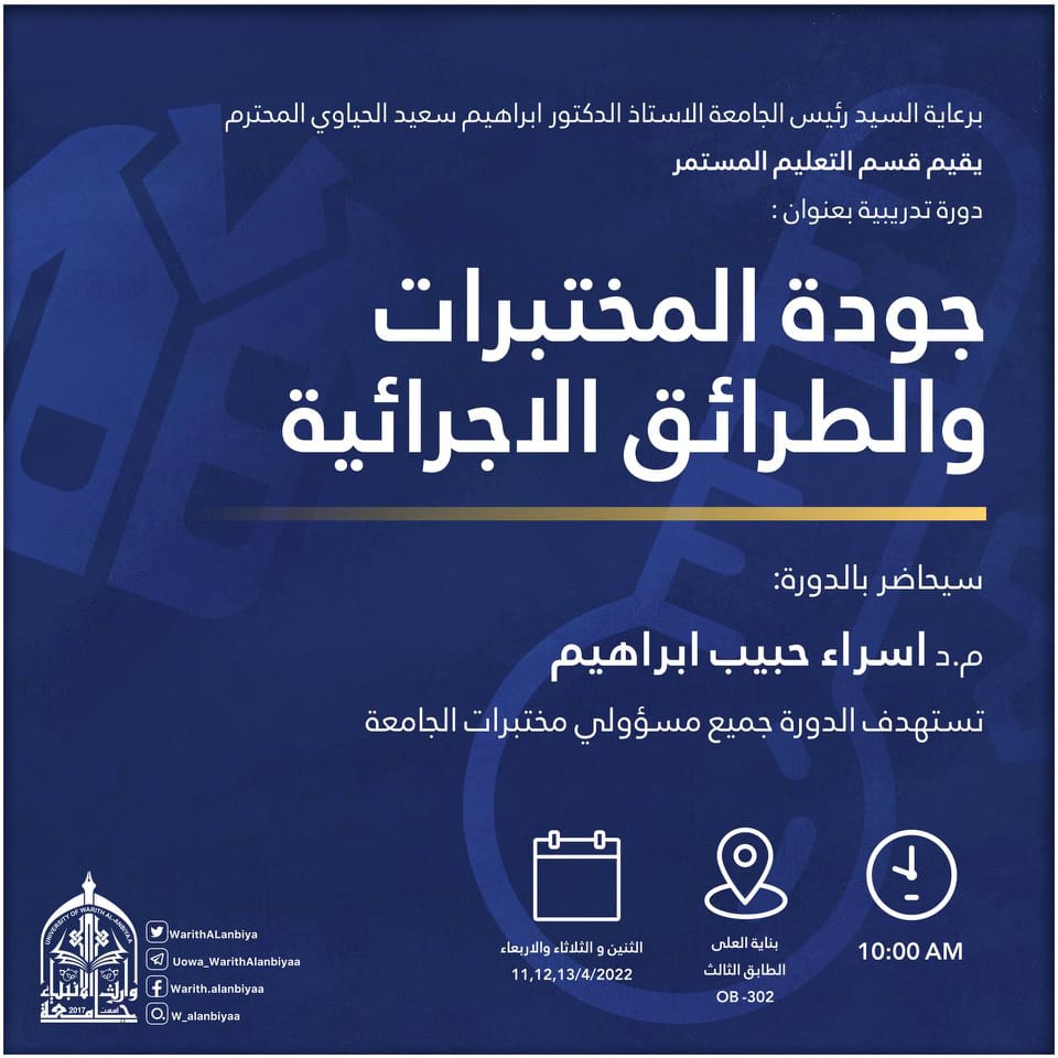 برعاية رئيس جامعة وارث الأنبياء (عليه السلام) الاستاذ الدكتور ابراهيم الحياوي أقام قسم التعليم المستمر في الجامعة دورة تدريبية بعنوان " جودة المختبرات والطرائق الاجرائية " حاضر فيها