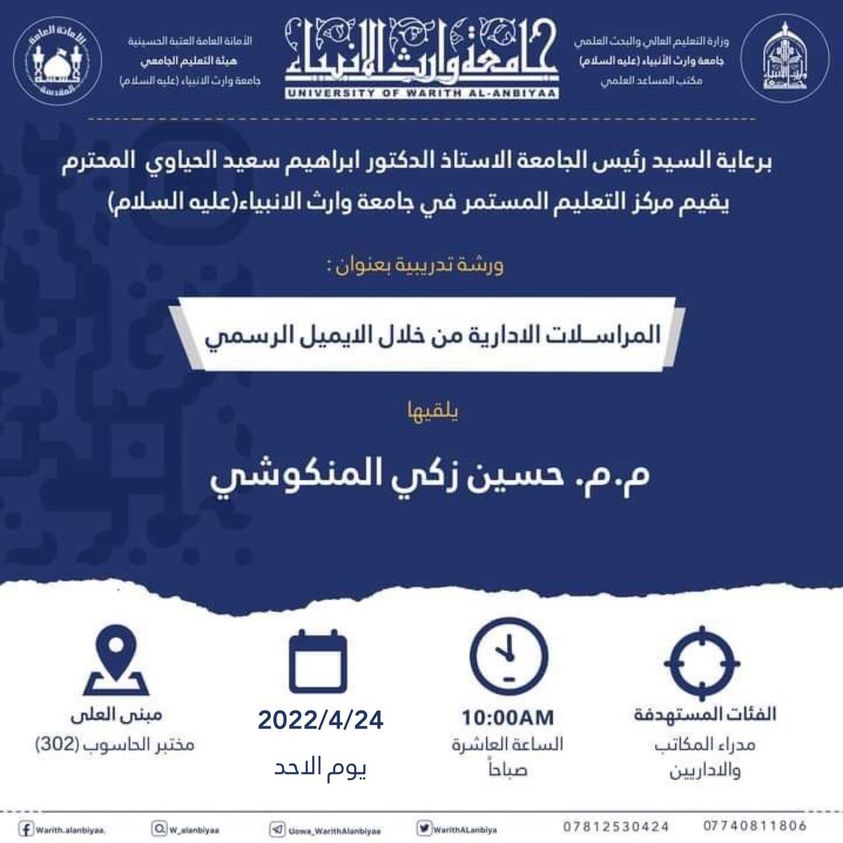 يعلن مركز التعليم المستمر في جامعة وارث الانبياء(عليه السلام) عن اقامة ورشة تدريبية بعنوان (المراسلات الادارية من خلال الايميل الرسمي) يحاضر في الورشة التدريبية المدرس المساعد حسين زكي ، تقام الدورة يوم الاحد الموافق 2022/4/24 في تمام الساعة العاشرة صباحاً في بناية العلى على قاعة مختبر الحاسوب (302).
