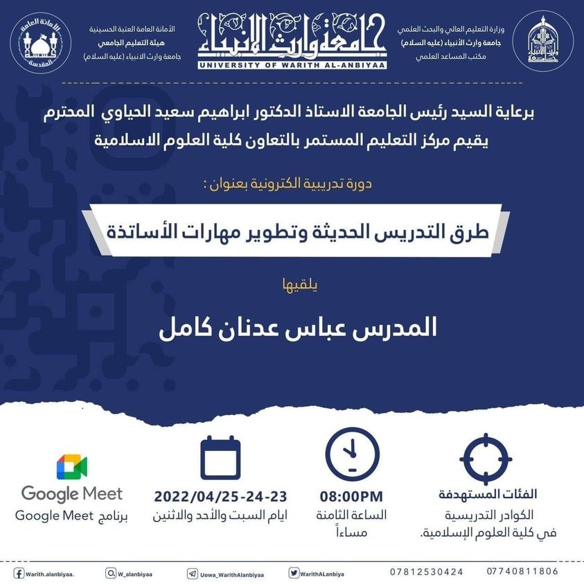 يعلن مركز التعليم المستمر في جامعة وارث الانبياء(عليه السلام) عن اقامة دورة  بعنوان (طرق التدريس الحديثة وتطوير مهارات الاساتذة) يحاضر في الدورة المدرس عباس عدنان كامل ، تقام الدورة ايام السبت والاحد والاثنين في تمام الساعة الثامنة مساءا على منصة Google Meet للانظمام للدورة يرجى الدخول على الرابط ادناه: