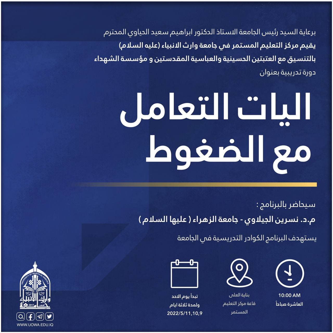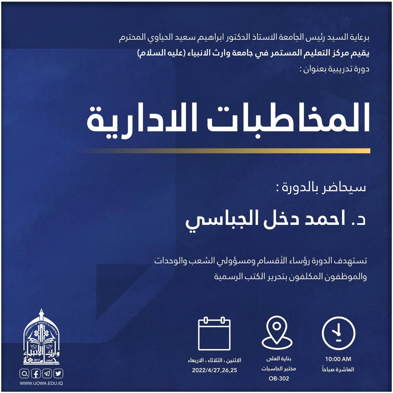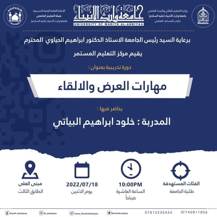 يقيم مركز التعليم المستمر في جامعة وارث الأنبياء (عليه السلام)  وبالتعاون مع كلية العلوم الاسلامية دورة تدريبية بعنوان (التصحيح اللغوي في المخاطبات الرسمية) والتي تعقد ابتداءً من يوم السبت الموافق 21/5/ 2022 ولمدة ثلاثة أيام، يلقي الدورة حضورياً كل من: