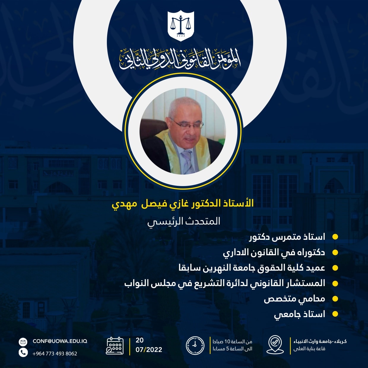 المؤتمر القانوني الدولي الثاني تحت شعار "الإصلاح التشريعي مقدمة لبناء الدولة القانونية" ينعقد المؤتمر في رحاب جامعة وارث الأنبياء (عليه السلام) بتأريخ 20-7-2022