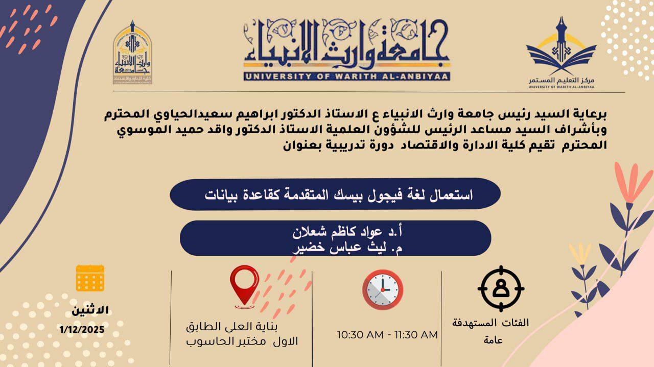*يحصل المشاركون على شهادة مشاركة في الدورة صادرة من مركز التعليم المستمر/ جامعة وارث الانبياء(عليه السلام).