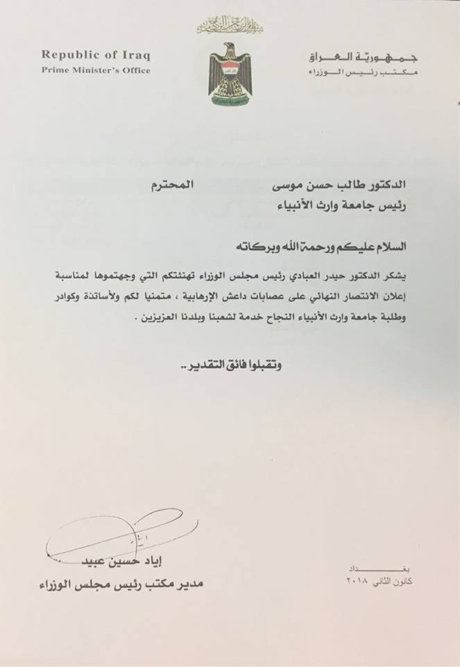 قدم الدكتور حيدر العبادي رئيس مجلس الوزراء كتاب شكر الى جامعة وراث الانبياء ردا على التهنئة التي قدمتها رئاسة الجامعة المتمثلة بالدكتور طالب حسن الموسوي بمناسبة إعلان النصر النهائي على عصابات داعش الارهابية حيث عبر رئيس الوزراء عن امنياته للجامعة ولأساتذة وكوادر وطلبة الجامعة بالنجاح خدمة لشعبنا وبلدنا العزيزين.