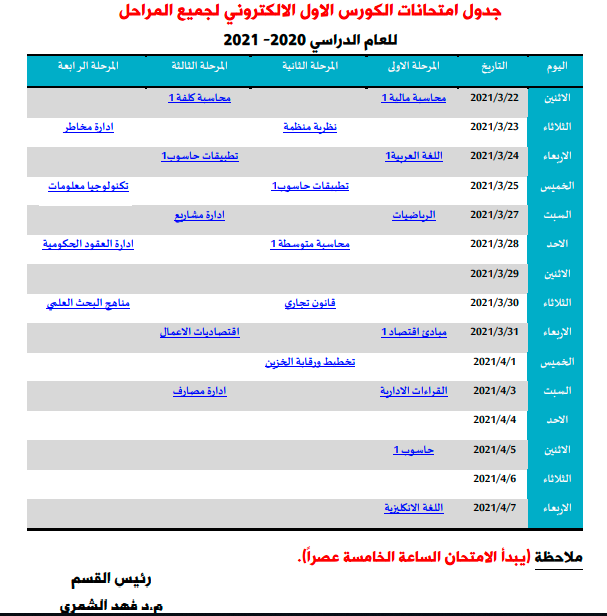 نرفق أليكم جداول الامتحانات الإلكترونية لجميع الأقسام العلمية
