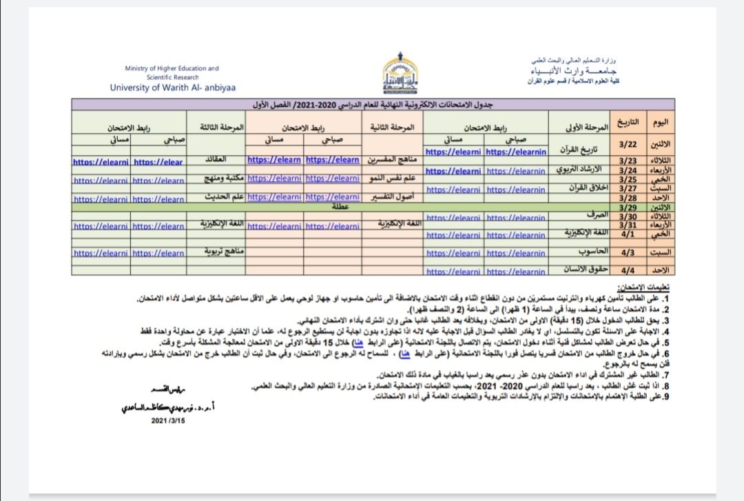 أعلن السيد مساعد رئيس جامعة وارث الأنبياء عليه السلام للشؤون العلمية الأستاذ الدكتور عباس كاظم الدعمي المحترم انطلاق الامتحانات النهائية للفصل الدراسي الأول في الدراسات الأولية للعام الدراسي (2020/ 2021) هذا اليوم السبت الموافق (20/ 3/ 2021).