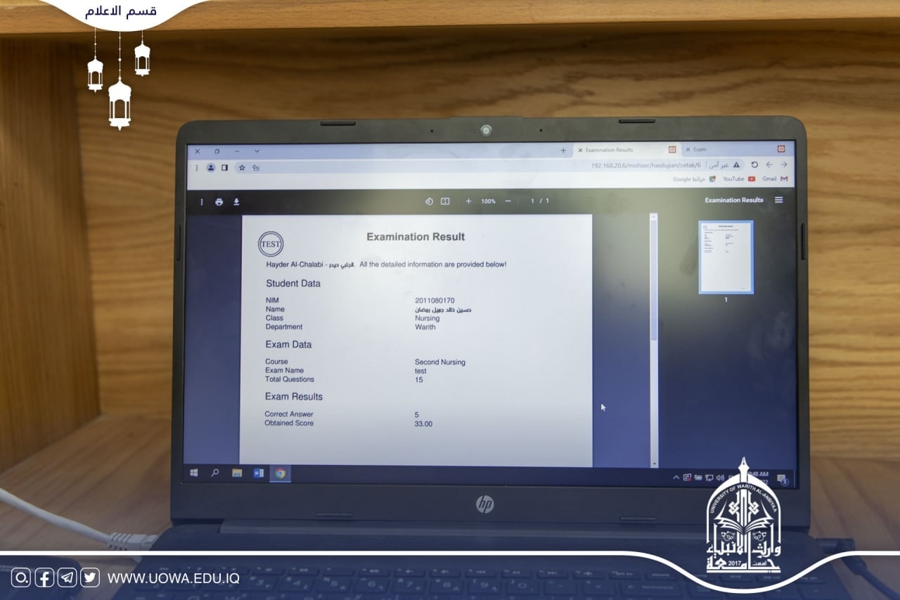 بإشراف السيد رئيس الجامعة الاستاذ الدكتور ابراهيم الحياوي والسيد المساعد العلمي الاستاذ الدكتور عباس الدعمي والسيد عميد كلية التمريض أ.م.د مرتضى الجبوريوبالتعاون مع مركز الحاسبة الالكترونية وشعبة التعليم الالكتروني في الجامعة أجرت كلية التمريض الامتحان التجريبي للاستعداد للامتحان التقويمي الوزاريحيث أدى الطلبة الامتحان بعد استلام الاسئلة الوزارية من قبل عميد الكلية الاستاذ المساعد الدكتور مرتضى الجبوري والفريق الالكتروني للجامعة الذي بدوره وزع الاسئلة على الطلبة، وتابع الفريق الوزاري من خلال المنصة الالكترونية المخصصة للامتحان التجريبي سير العملية الامتحانية داخل الكلية من خلال الدخول الى القاعات الامتحانية والتحدث مع رئيس الجامعة وعميد الكلية، والمراقبين الموجودين هناك ،وقد أشادوا بالتنظيم العالي الذي أقامته الكلية لأداء الامتحان.يذكر أن جامعة وارث الانبياء (عليه السلام) قد جهزت مسبقاً ثمانية مختبرات علمية بأحدث الوسائل التعليمية الحديثة.