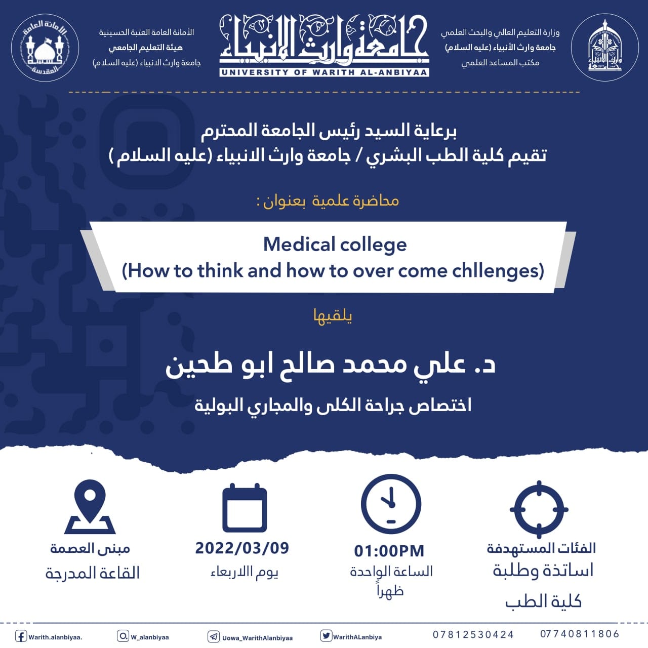 برعاية السيد رئيس جامعة وارث الأنبياء (عليه السلام)، تقيم كلية الطب البشري في الجامعة محاضرة علمية بعنوان "How to think and how to over come challenges" يلقيها الدكتور علي محمد صالح أبو طحين