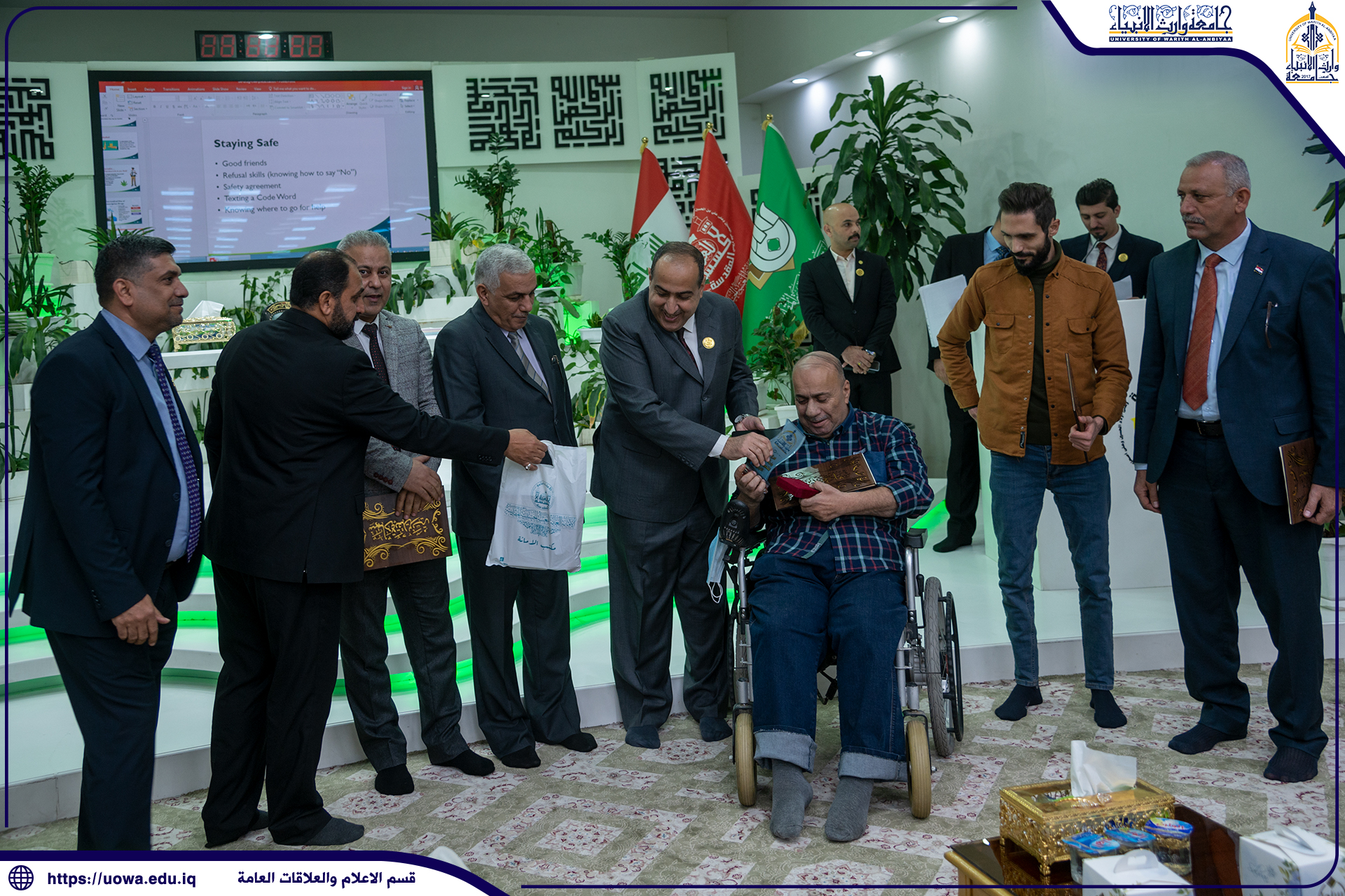 بحضور سماحة المتولي الشرعي للعتبة الحسينية المقدسة الشيخ عبد المهدي الكربلائي(دام عزه)وعدد من الشخصيات العلمية والأكاديمية والاجتماعية، اختتمت جامعة وارث الانبياء (عليه السلام) مسابقتها البحثية الأولى بتوزيع الجوائز على الباحثين العشرة الاوائل. وقال السيد رئيس الجامعة الاستاذ الدكتور ابراهيم الحياوي: "نظمت جامعتنا هذه المسابقة برعاية وزارة التعليم العالي والبحث العلمي، وهي الأولى من نوعها في العراق لتكريم الباحثين العراقيين المتميزين، حيث أشترك فيها اكثر من 650 باحث وباحثة من مختلف الجامعات العراقية الحكومية والأهلية ضمن محاورها الثلاثة (الطبية والهندسية والعلوم الصرفة).وأضاف الحياوي: " جاءت هذه الجائزة لدعم الباحثين وتشجيعهم و الإسهام في حل المشكلات المجتمعية، ولتقديم جهد علمي بحثي يسهم في تطوير الحركة العلمية والأكاديمية في بلدنا العزيز، ونحن نسعى لإصدار نسخة مطورة عن المسابقة في المستقبل بما يسهم في تطوير عمل المؤسسات التعليمية الرصينة".