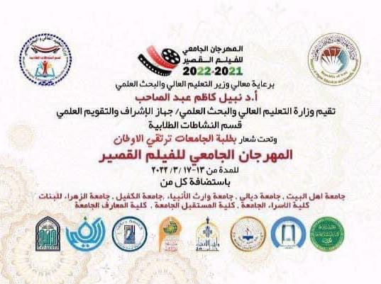 برعاية وزير التعليم العالي والبحث العلمي الاستاذ الدكتور نبيل عبد الصاحب استضاف قسم النشاطات الطلابية في الوزارة، عدد من الجامعات بضمنها جامعة وارث الانبياء(عليه السلام)، لافتتاح (المهرجان الجامعي للفيلم القصير) الذي يقام تحت شعار "بطلبة الجامعات ترتقي الأوطان" وبمشاركة ثلاثين جامعة وكلية حكومية وأهلية.وقال الدكتور همام الخفاجي رئيس قسم النشاطات الطلابية في الجامعة: "تضمن المهرجان محاور مهمة مثل احترام الآخر، وأهمية التعاون والعمل التطوعي ونبذ التنمر، كما تم اعداد أفلام من قبل الطلبة وفق هذه المحاور من حوار وتمثيل واخراج".وأضاف الخفاجي: " وسيتم اختيار الافلام المتميزة و عرضها في ختام المهرجان مع جوائز عدة عن أفضل عمل و أفضل ممثل وأفضل سيناريو بالإضافة الى جوائز للطلبة المتميزين".
