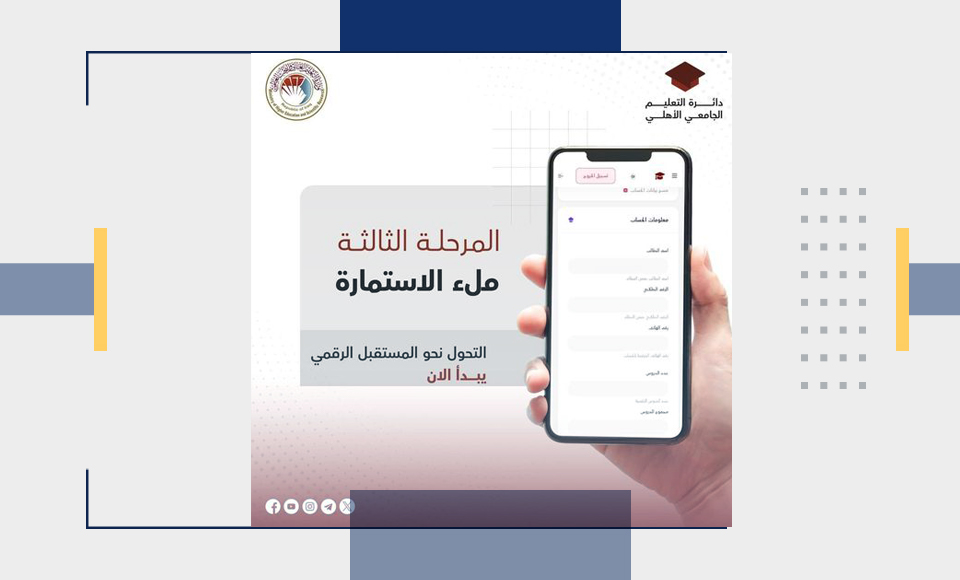 اعزاءنا الطلبة سيتم اطلاق مراحل التقديم تباعاً عبر رابط البوابة الإلكترونية لدائرة التعليم الجامعي الأهلي