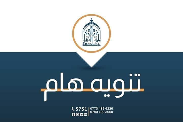تعلن جامعة وارث الأنبياء (عليه السلام) عن شمول خريجي الدراسة الإعدادية من فرع الفنون التطبيقية، قسم التربية الأسرية، بالتقديم لكلية العلوم الإسلامية، قسم علوم القرآن وقسم الفقه وأصوله.