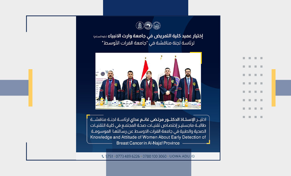 تم اختيار الأستاذ الدكتور مرتضى غانم عداي، عميد كلية التمريض، لرئاسة لجنة مناقشة رسالة ماجستير في اختصاص تقنيات صحة المجتمع بكلية التقنيات الصحية والطبية في جامعة الفرات الأوسط. الرسالة التي أعدتها الطالبة تناولت موضوع (معرفة وموقف النساء حول الكشف المبكر عن سرطان الثدي في محافظة النجف).