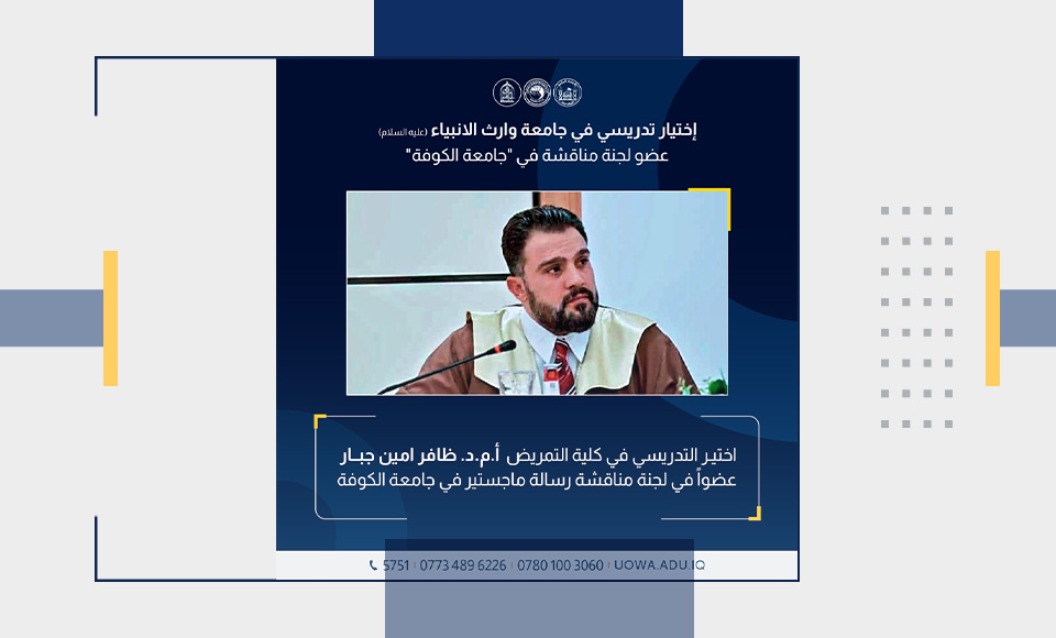 تم اختيار الأستاذ المساعد الدكتور ظافر أمين جبار، التدريسي في كلية التمريض بجامعة وارث الأنبياء (عليه السلام)، عضواً في لجنة مناقشة رسالة ماجستير لأحد طلبة الدراسات العليا في جامعة الكوفة/ كلية التمريض.