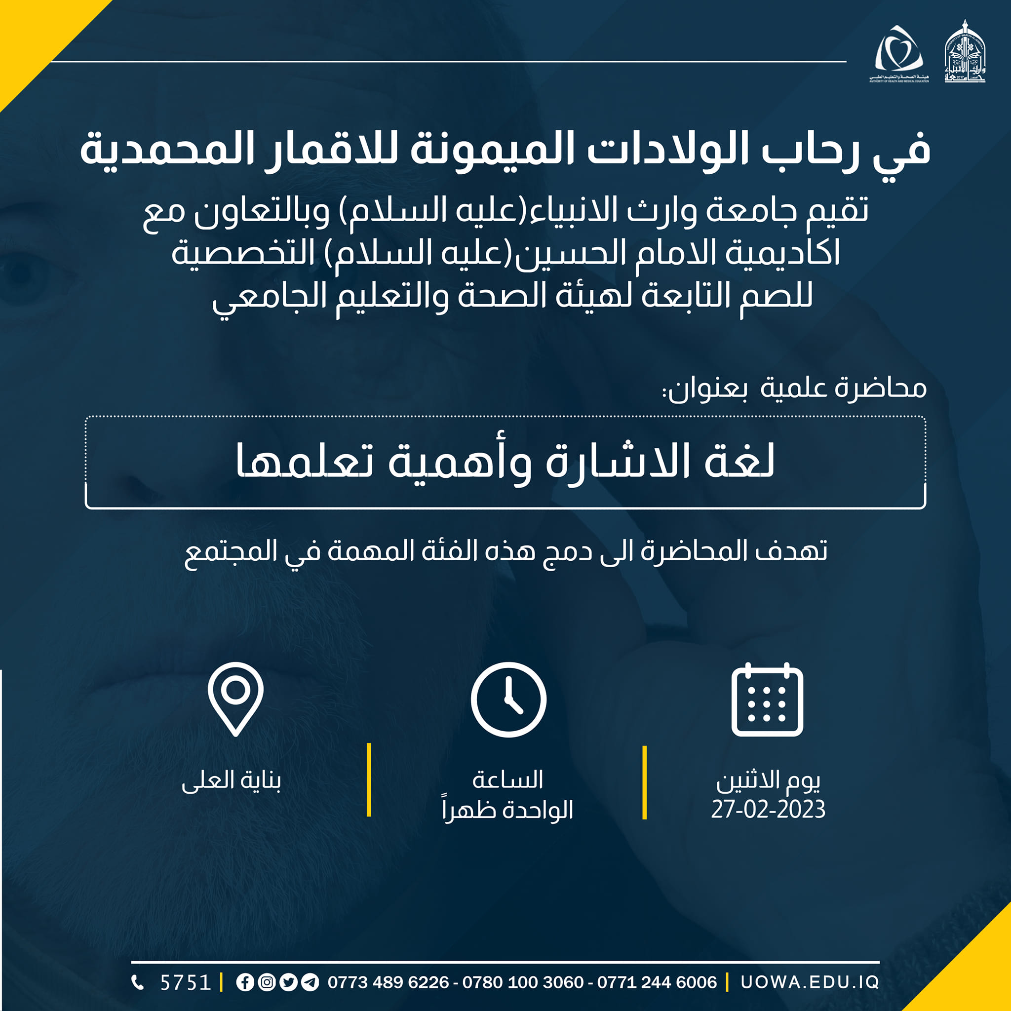 ضمن مبادرة "بركات الإنوار المحمدية" التي اطلقتها هيئة الصحة والتعليم الجامعي، وبحضور عدد من مدراء جمعيات الصم في المحافظات العراقية، أقامت جامعة وارث الانبياء(عليه السلام) وبالتعاون مع أكاديمية الامام الحسين (عليه السلام) التخصصية للصم، ندوة علمية لطلبة كلية الطب عن "لغة الإشارة واهمية تعلمها" قدمها مدير الإكاديمية باسم العطواني.