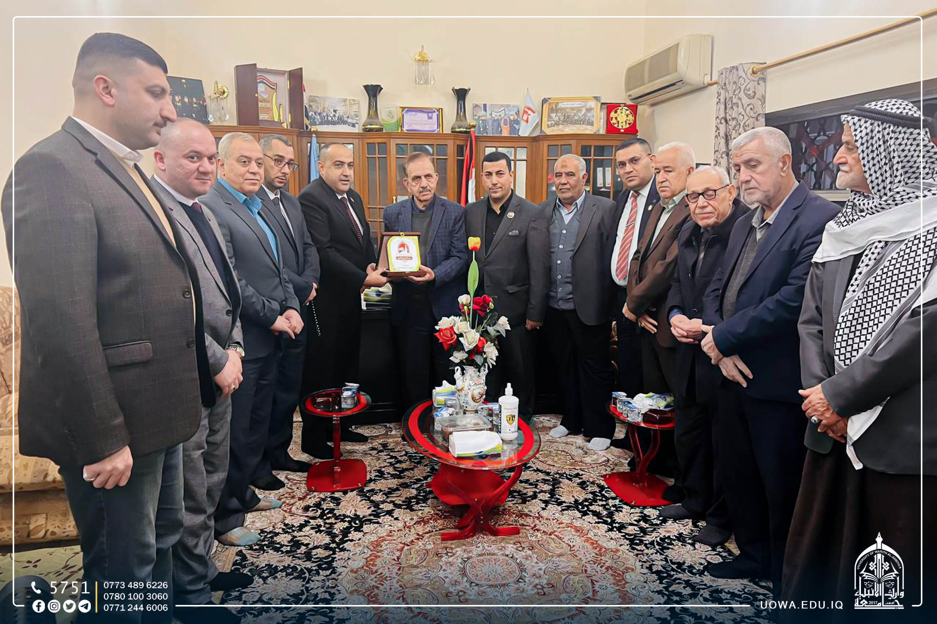 تثميناً لجهودهم المبذولة في خدمة زائري اربعينية الامام الحسين(عليه السلام) في كل عام، كرمت طبابة هيئة الحشد الشعبي/ فرع كركوك رئاسة جامعة وارث الانبياء (عليه السلام) فضلاً عن عمادة كلية التمريض، إذ قدم الوفد الزائر دروع الشكر والعرفان لما قدمته الجامعة من تسهيلات في كل عام عبر نصب المشفى المتنقل داخل الجامعة لخدمة زائري اربعينية الامام الحسين (علية السلام) بالاضافة الى المتطوعين من اساتذة وطلبة كلية التمريض .