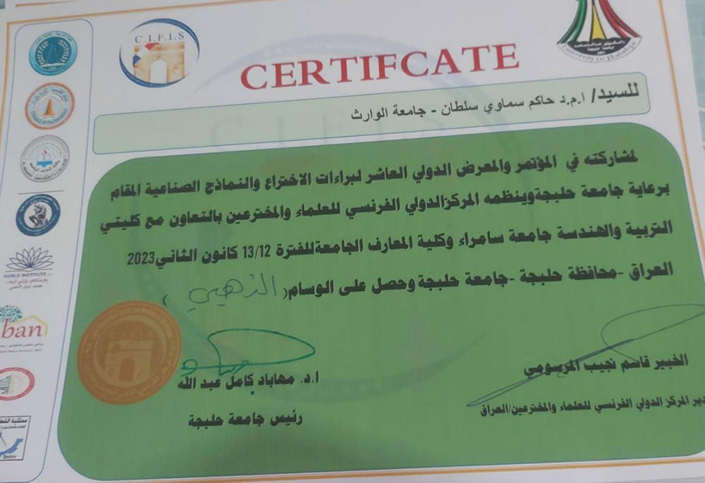 "الوسام الذهبي" و"وسام الابداع" و"شكر وتقدير" عن مشاركته ببراءة اختراع جديد في"المؤتمر الدولي لبراءات الاختراع والنماذج الصناعية"، الذي نظمه المركز الدولي الفرنسي للعلماء والمخترعين في جامعة حلبجة وجامعة السليمانية.