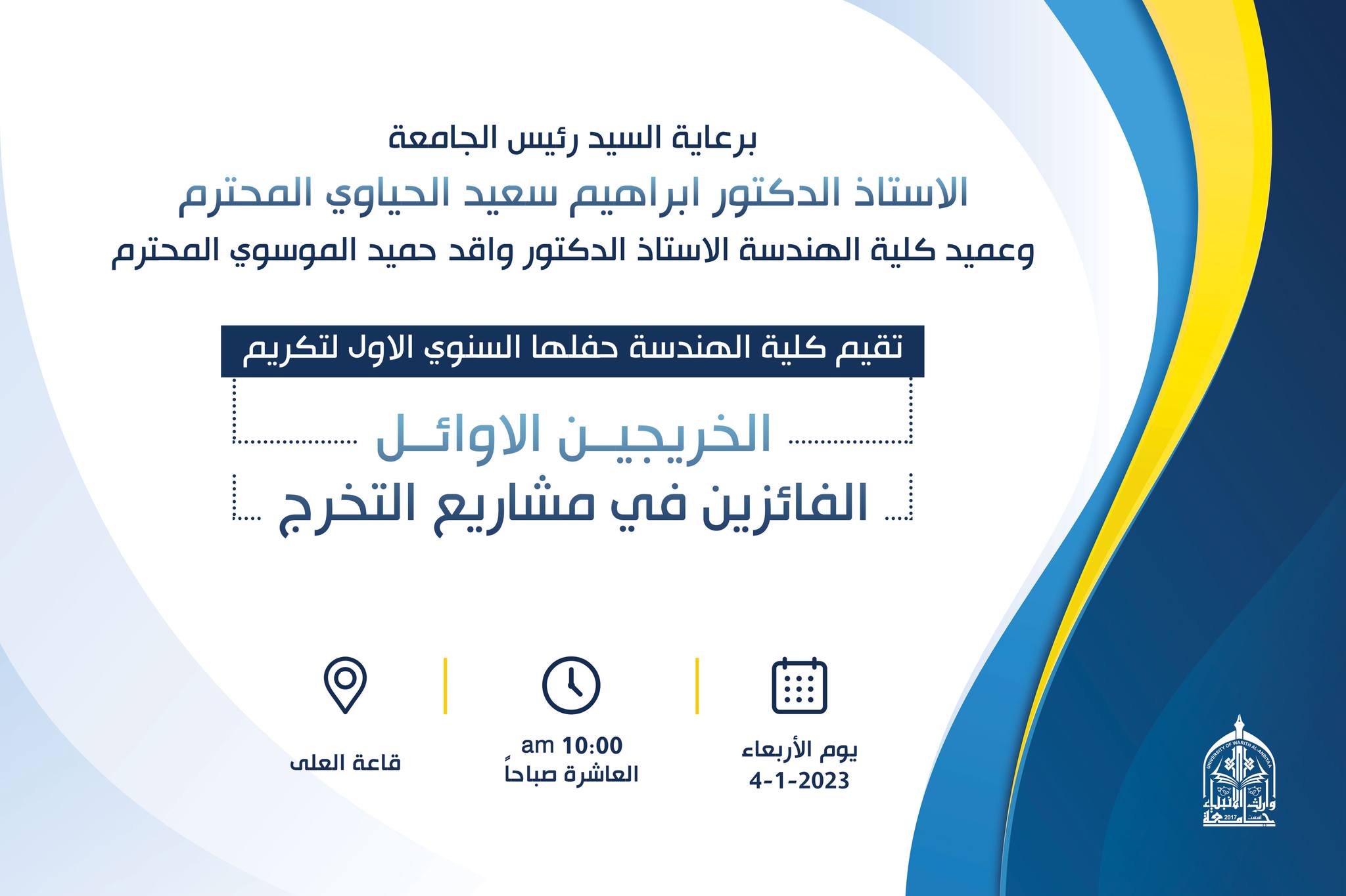 برعاية رئيس جامعة وارث الانبياء (عليه السلام) الاستاذ الدكتور ابراهيم الحياوي وعميد كلية الهندسة الاستاذ الدكتور واقد حميد الموسوي، تقيم كلية الهندسة حفلها السنوي الاول لتكريم الخريجين الاوائل الفائزين في مشاريع التخرج.