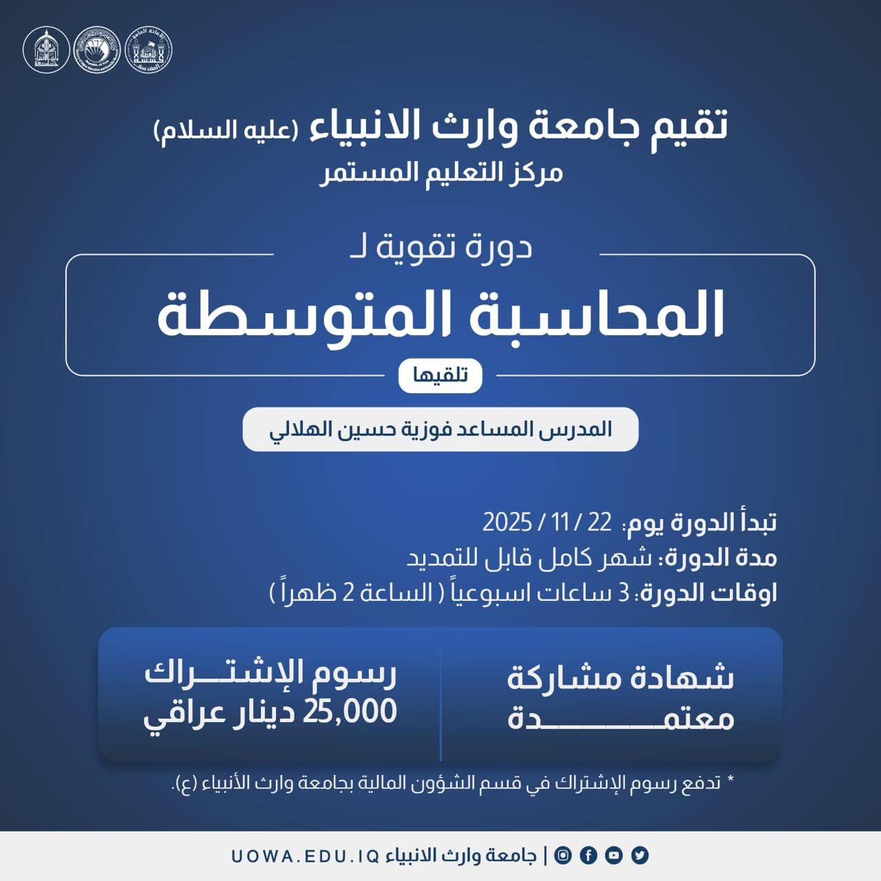 ​The Continuing Education Center at Warith Al-Anbiyaa University  is pleased to announce the continuation of registration for the Intermediate Accounting Reinforcement Course.