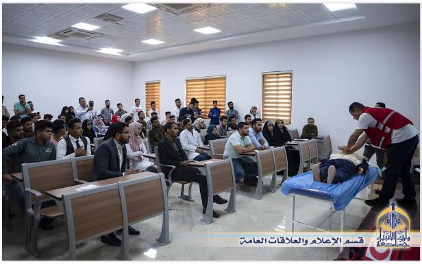 The Center for Continuous Education at the University of Warith Alanbiyaa (PBUH) organized, in coordination with the Iraqi Red Crescent Society, the branch of Karbala, a training workshop in first aid for the university employees and students. The workshop included training the participants on how to assist patients and the injuries in emergency cases and accidents. Also, it included the training on what are the alternative situations before transferring the patient to the hospital in the first minutes of the infection, which included all the steps to be taken to deal with these cases in a simplified form and practical application. This is to facilitate learning and to behave wisely to avoid these issues such as the cases of (Suffocation, drowning, fire, and explosions) and the emergency cases such as unconsciousness. Additionally, it involved training on how to deal with each case differently from the other as well as training on the principles of first aid in the emergency cases as a result of what is exposed to our country and to the citizen in the daily life. Meanwhile, Mr. Samir Nizar Abd, a first aid trainer in the Crescent, said it is necessary to train everyone on first aid because it is the best way to save the lives of citizens in the first minutes of the incident, which is the golden minutes to save the life of the injured people.