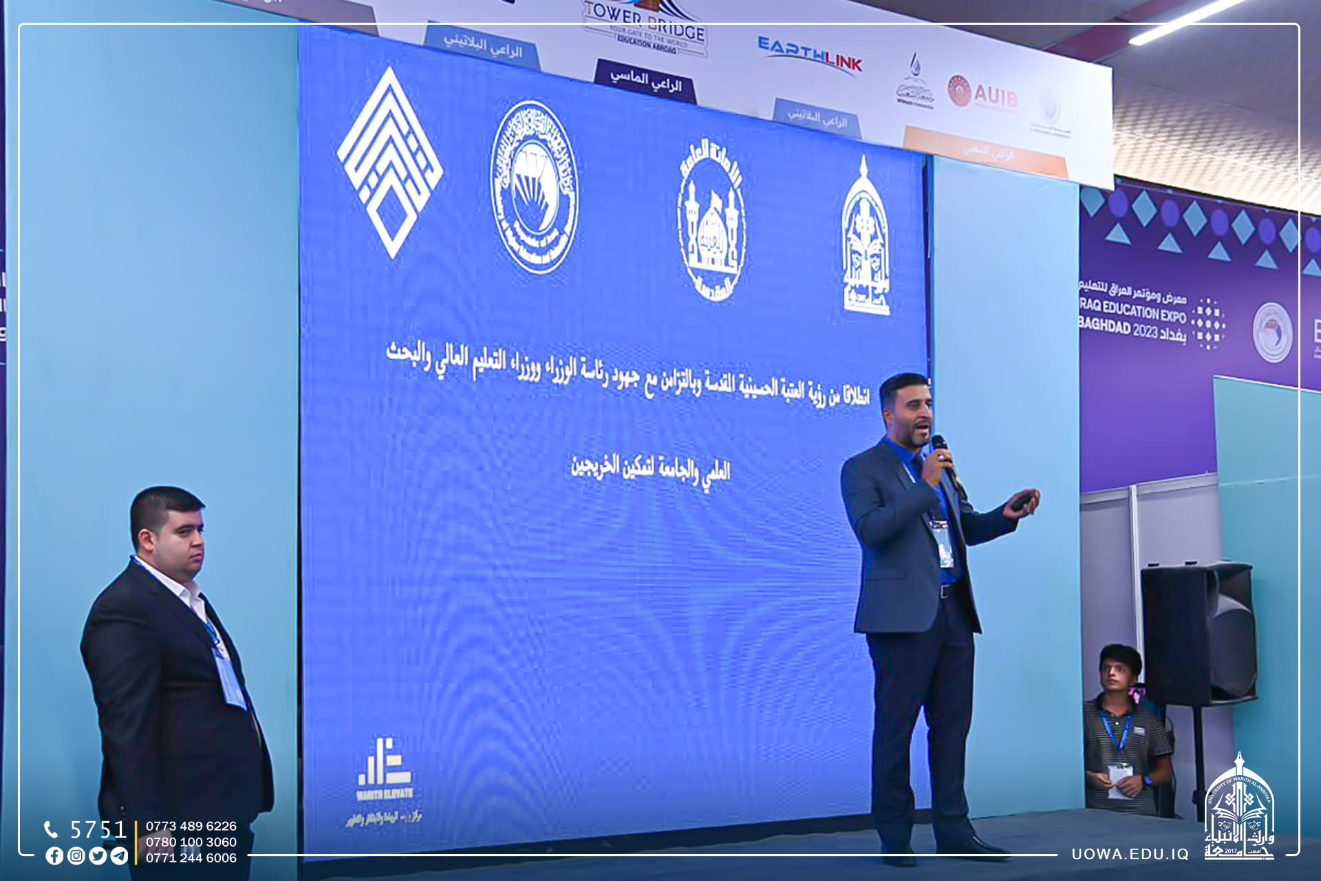 The Warith Elevate University pavilion continues to participate in presenting many scientific and academic events within the “Iraq Education Conference and Exhibition,” where the Warith Elevate team provided an explanation of the center’s services to the university’s graduates and students and how to contribute to their qualification and training to prepare them to engage in the labor market, and employ them within the institutions of the Holy Imam Hussein Shrine in addition to the university’s support for the “Reyada Government Initiative” by holding training courses at the university.