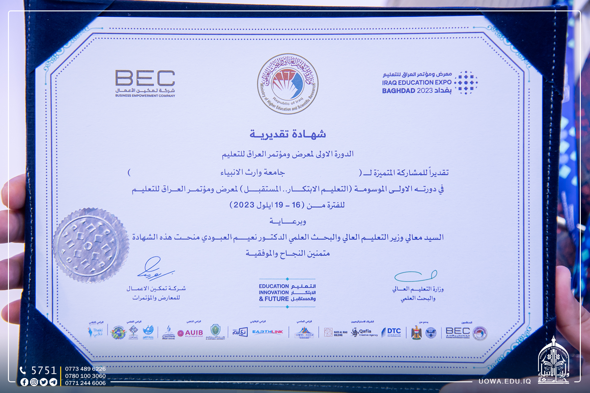 The Ministry of Higher Education and Scientific Research honored Wraith Al-Anbiyaa University at the conclusion of the first edition of the "Iraq Education Exhibition and Conference." This recognition was a commendation of the university's exceptional efforts and its active participation in the events and activities of the exhibition.